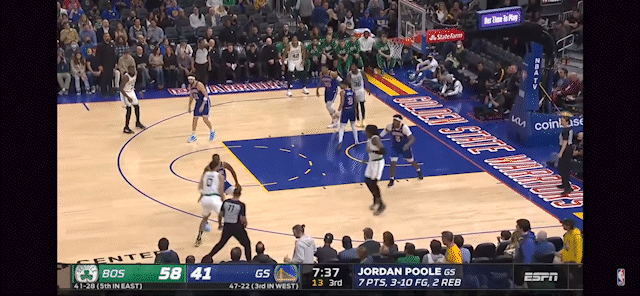 On the surface this is just really good offense and shot-making by Jordan Poole on more split action. That is true, but if you watch closely you can see Tatum call the action out just as it begins the develop. Immediately upon the "split" Tatum instinctively jumps towards the paint expecting Moody to cut, as often times the film shows. In this league sometimes you just have to credit good offense however its this type of recognition and communication that will give the Celtics success in defending the Warriors activity.